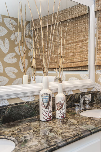 The dark red wallpaper had to go. We replaced it with a textural grass cloth wall covering and redesigned the shower to create a tropical look.